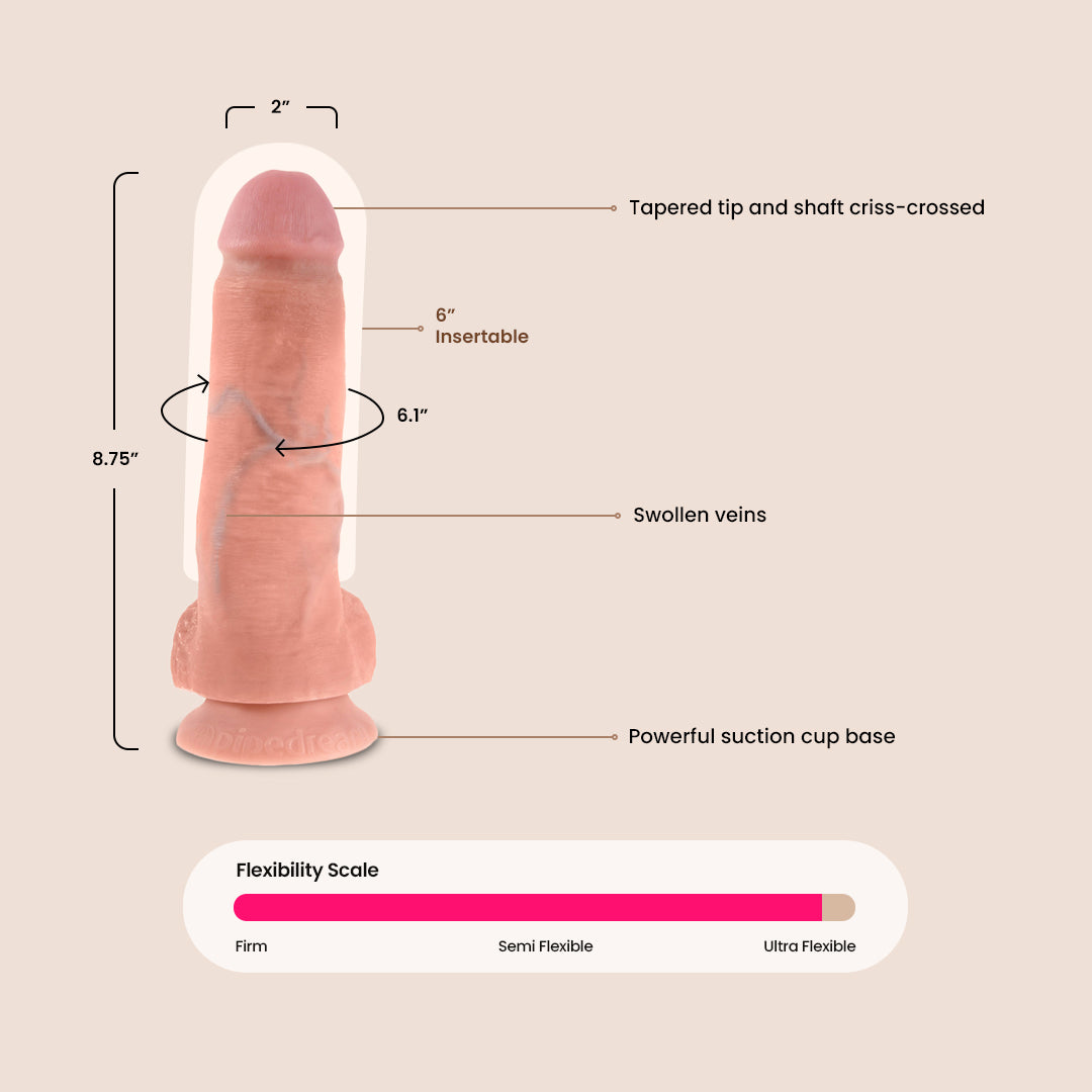 Just the right thickness Just the right length The angle of the dangle was perfect. It hit all the right spots. Stretched without really hurting my ass. I love it! Now to find the guy who modeled for this thing and make him my husband!
