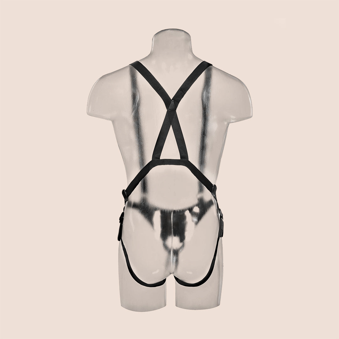 As things turned out we use it more as a dildo -- which she LOVES!! -- as the harness fit her but not me. It is long and thick - like 2--3 soda cans. Stretched her well. We use either lots of lube or condom on it as the dildo material feels sticky and not slippery even after washing. But still she LOVES it.