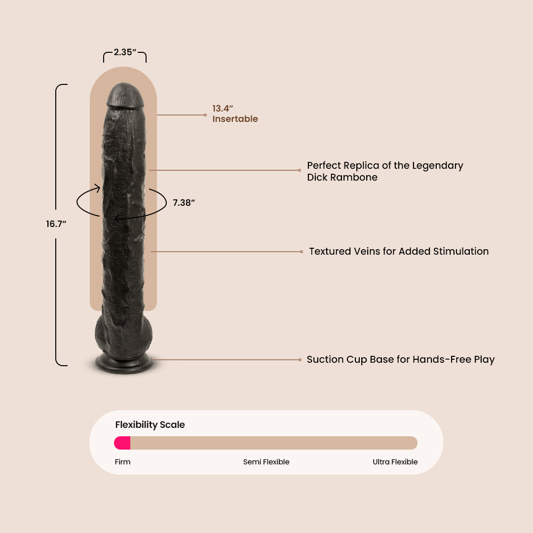 This dildo is amazing. It is so big it feels so good it makes me cum without a single stroke to my cock. I have a gigantic selection of gigantic dildos. All of them more expensive most of them inferior in one or more ways. None of them do I have up my ass more than Dick Rambone. It is my go to dildo. I go to it most everyday ignoring the other 9 or 10 huge dildos in my collection . The texture and girth are perfect the suction cup base adheres to any smooth surface and stays put so you can concentrate on taking it deepeer and deeper. . I like to get it in me 13+ inches and just sit back with it buried for a long time moaning praying and shaking with extasy. It is so damn good. It is a good preparation for my goal of Handballing in the near future. Great cheap dildo but cheap monetarily not cheap in quality or size . Possibly the greatest value in all big dildos. I