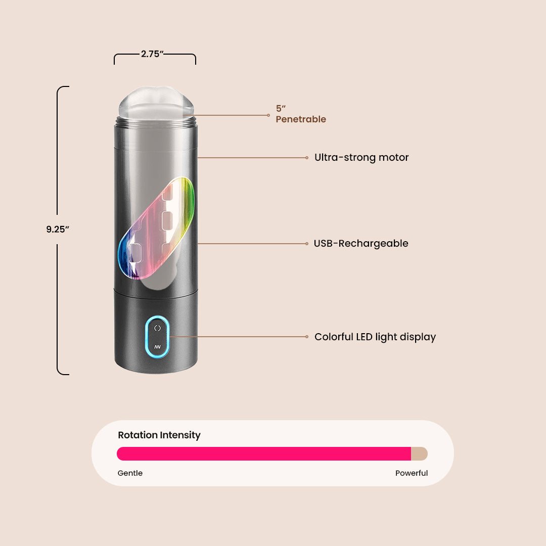 I love it ! It makes me Cum So Hard my Legs Go Straight.......The Good The bad, I tore the Lips with the first use, and cannot get my entire shaft in All the way. I'm average size just a little to much girth, 6" 1/2" However the Rotating Masturbator is Fucking Awesome!!! My Girl Friend LOVES Watching and using it on me. Makes her Cum like Crazy Just watching...or Playing with Her Self. She Loves to have me pump this Cum Maker While she Holds it till I'm Squirting Cum all over Both of Us....