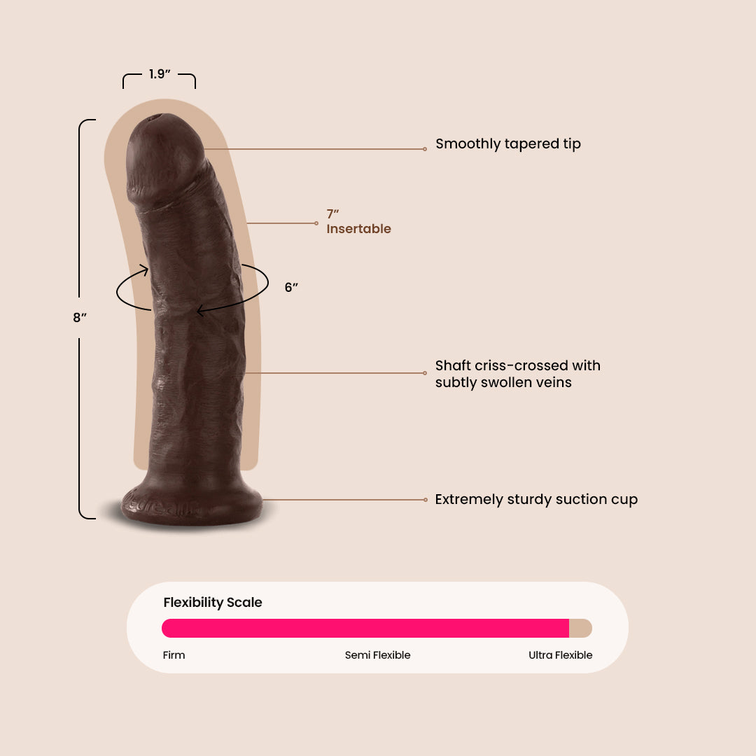 Very realistic detailing. Excellent texture. Nice balance of flexibility, rigidity, and give. I have several King Cock dildos in different sizes. The 8" is a good "every day size". It works great with the harness. The only problem I've had with it is that the suction is not great.