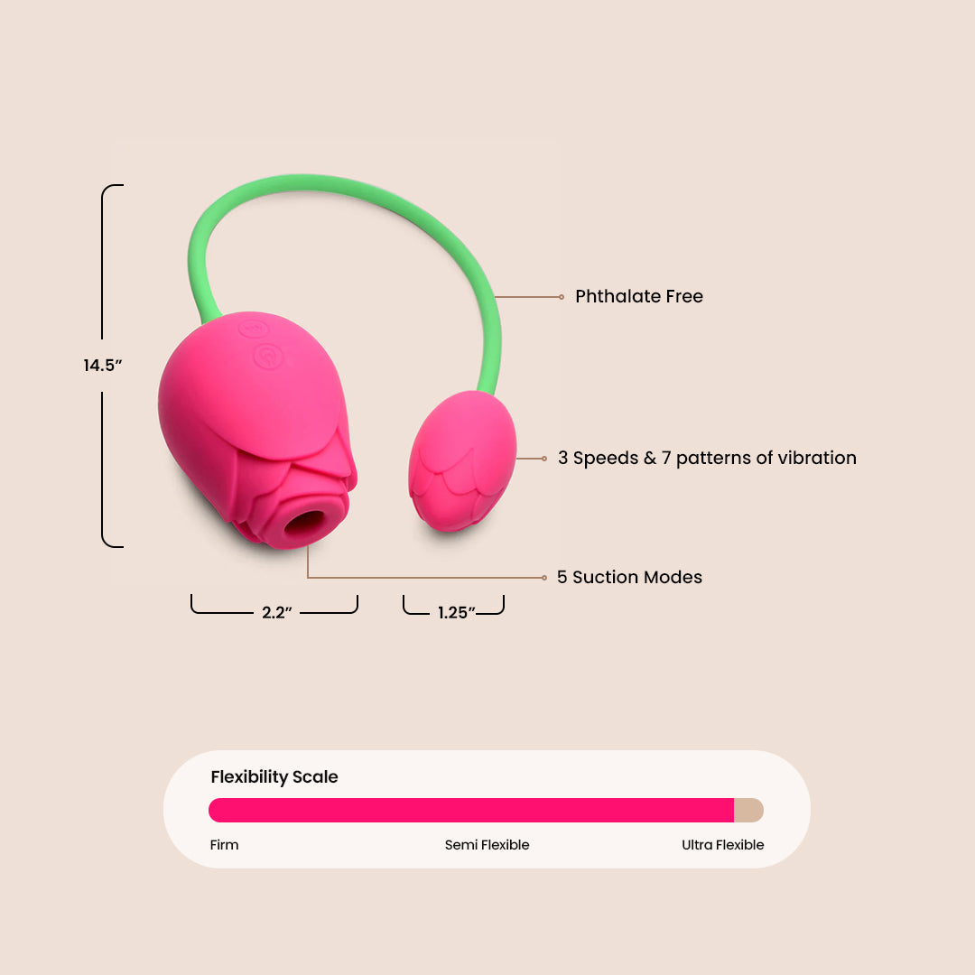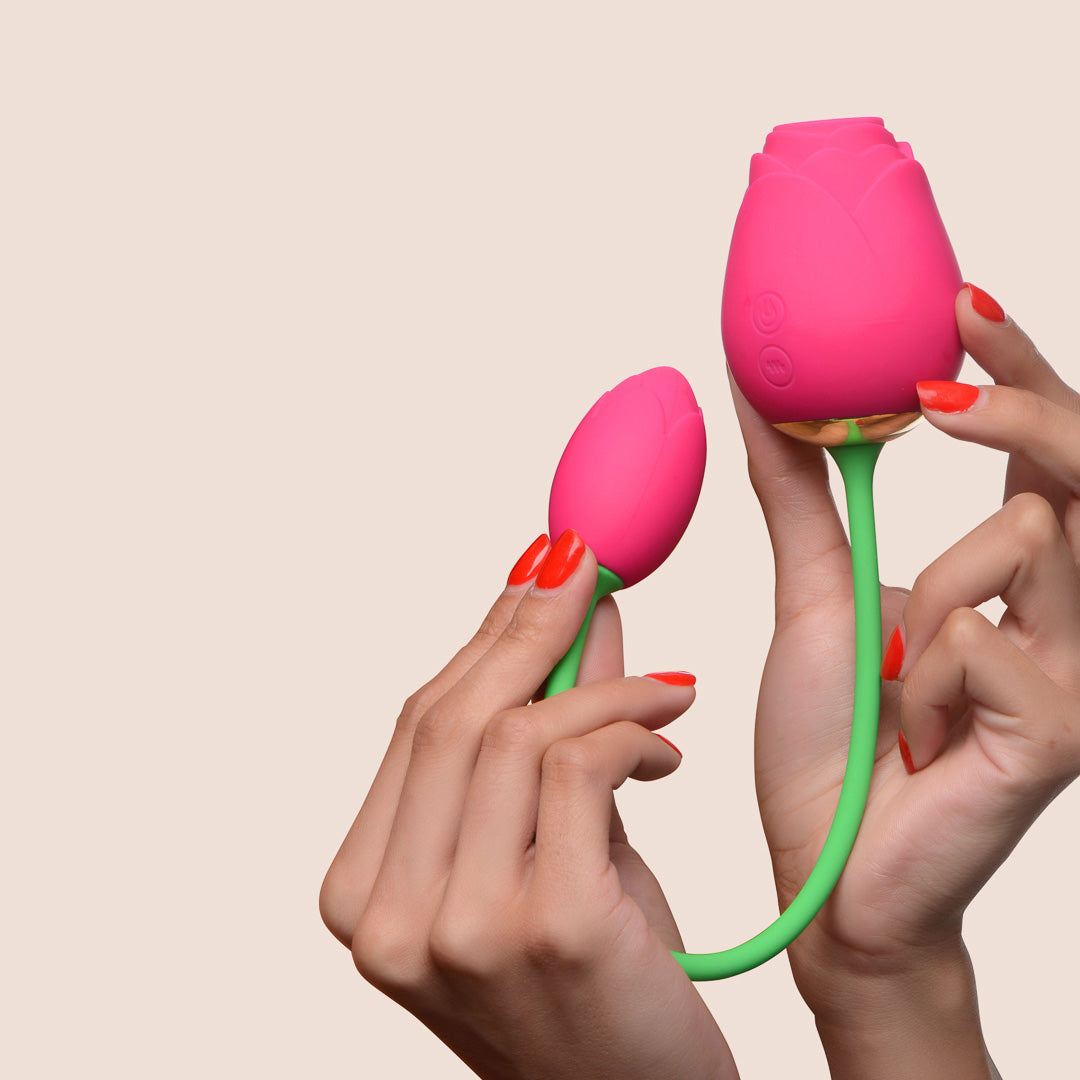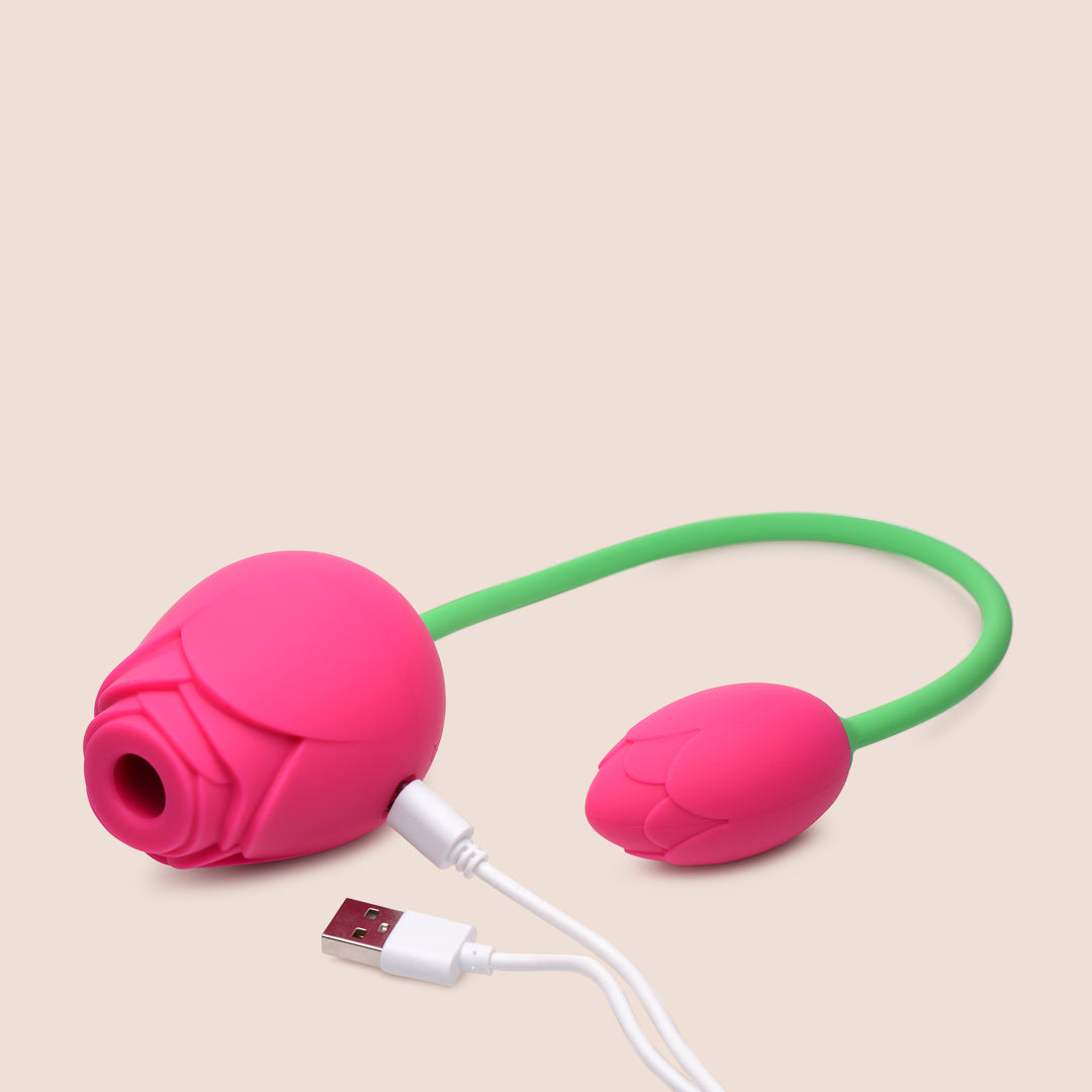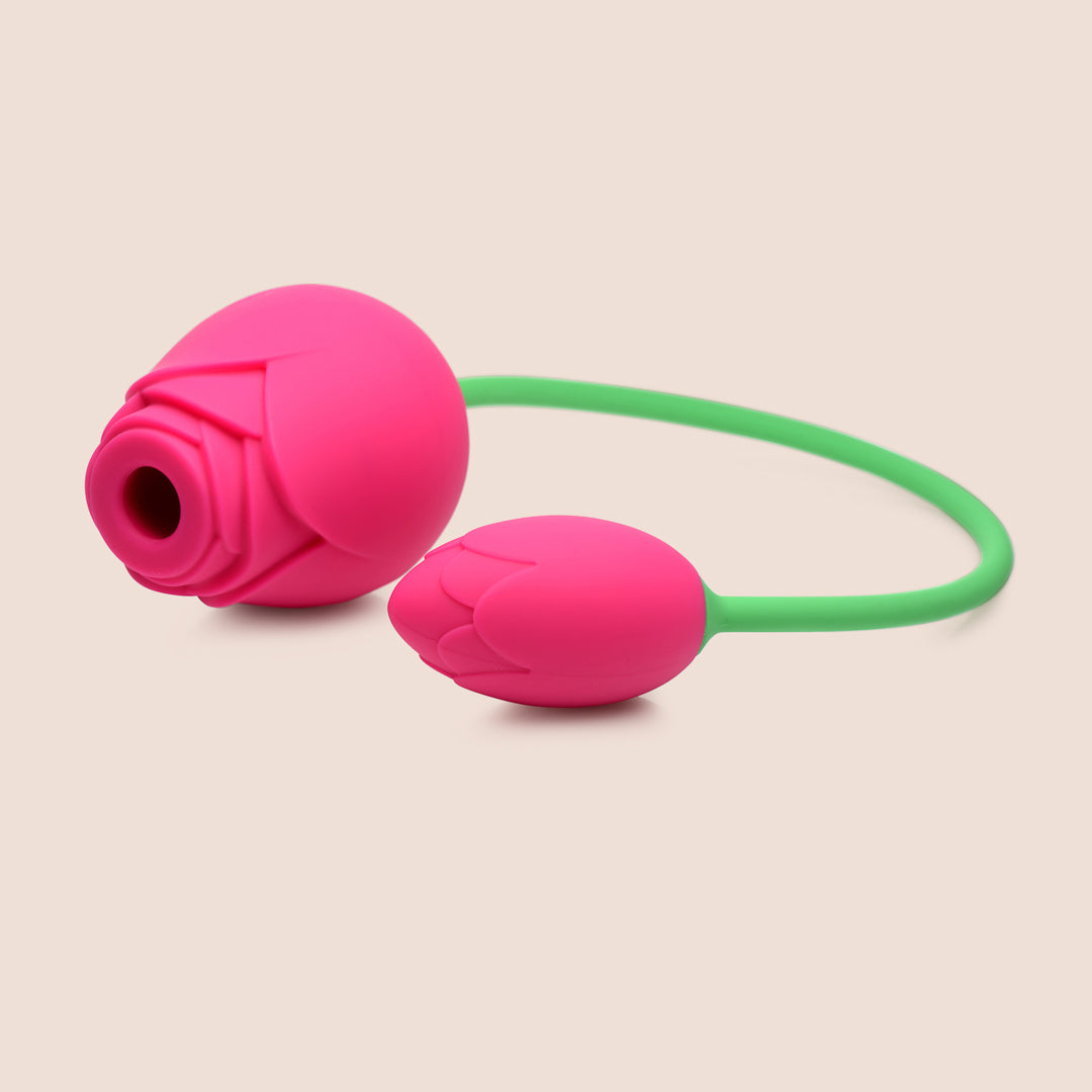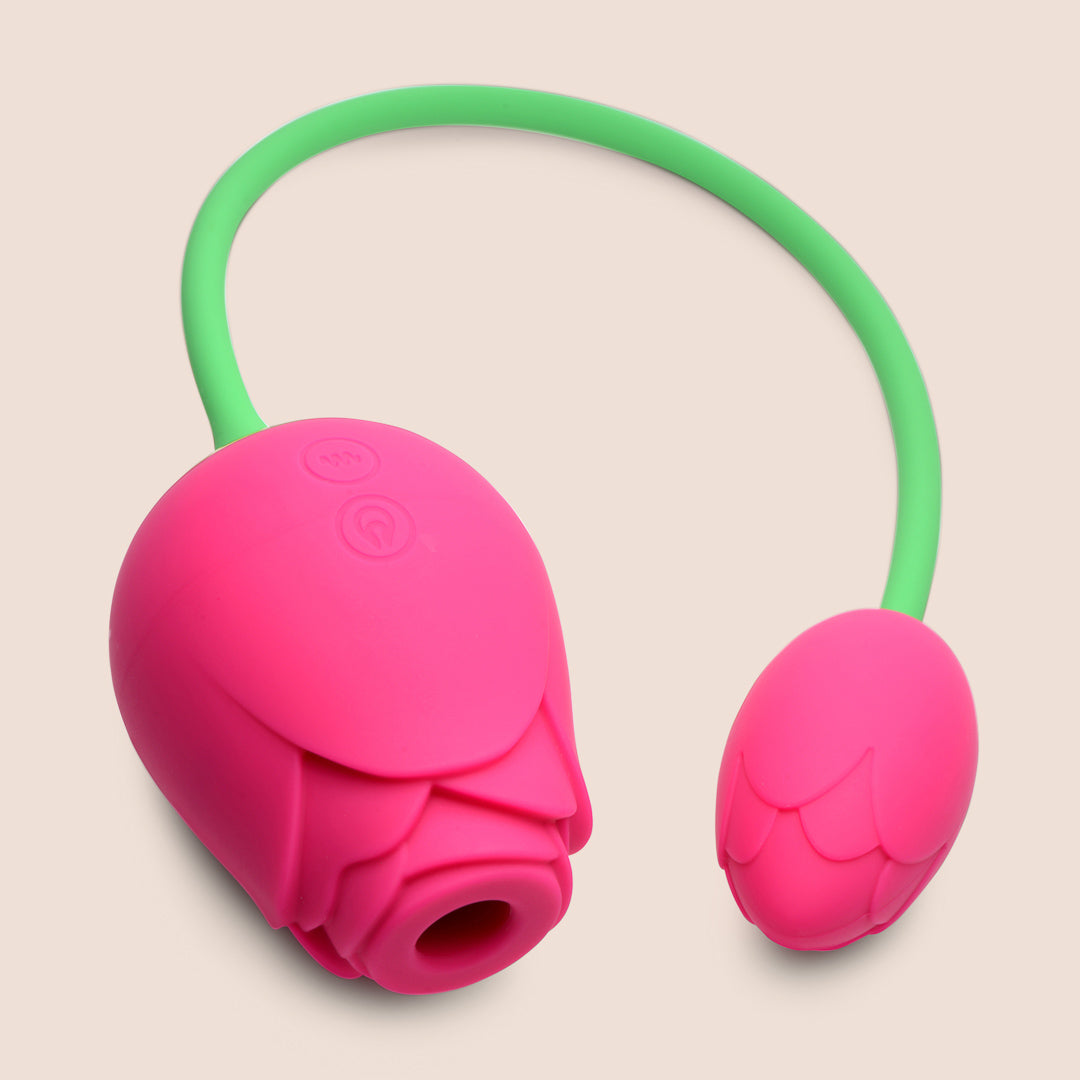 Let your petals unfurl with this dynamic duo of vibrating and sucking roses! These bad boys are built for mind-blowing blended orgasms - the smaller rose is perfect for inserting and delivering intense vibrations, while the larger rose will give your clit some serious TLC with its sucking action. The unique corded design lets you easily maneuver both roses to hit all your pleasure points.