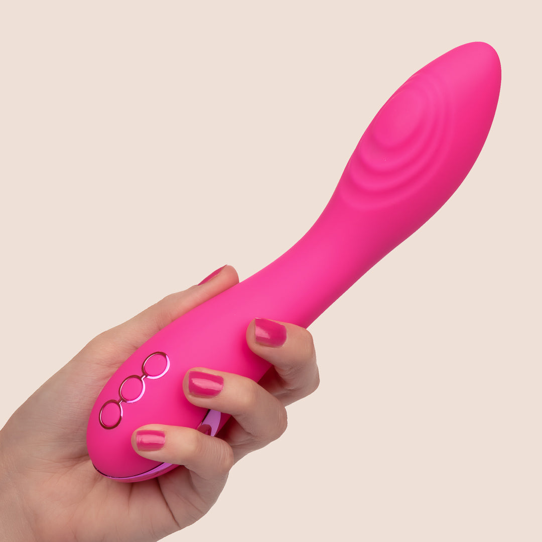 Indulge in waves of pleasure as the California Dreaming™ Surf City Centerfold teases and tickles you towards ecstasy. The powerful wand massager has 3 thrilling thumping pulsation intensities and 10 functions of vibration for a once in a lifetime pleasure experience.