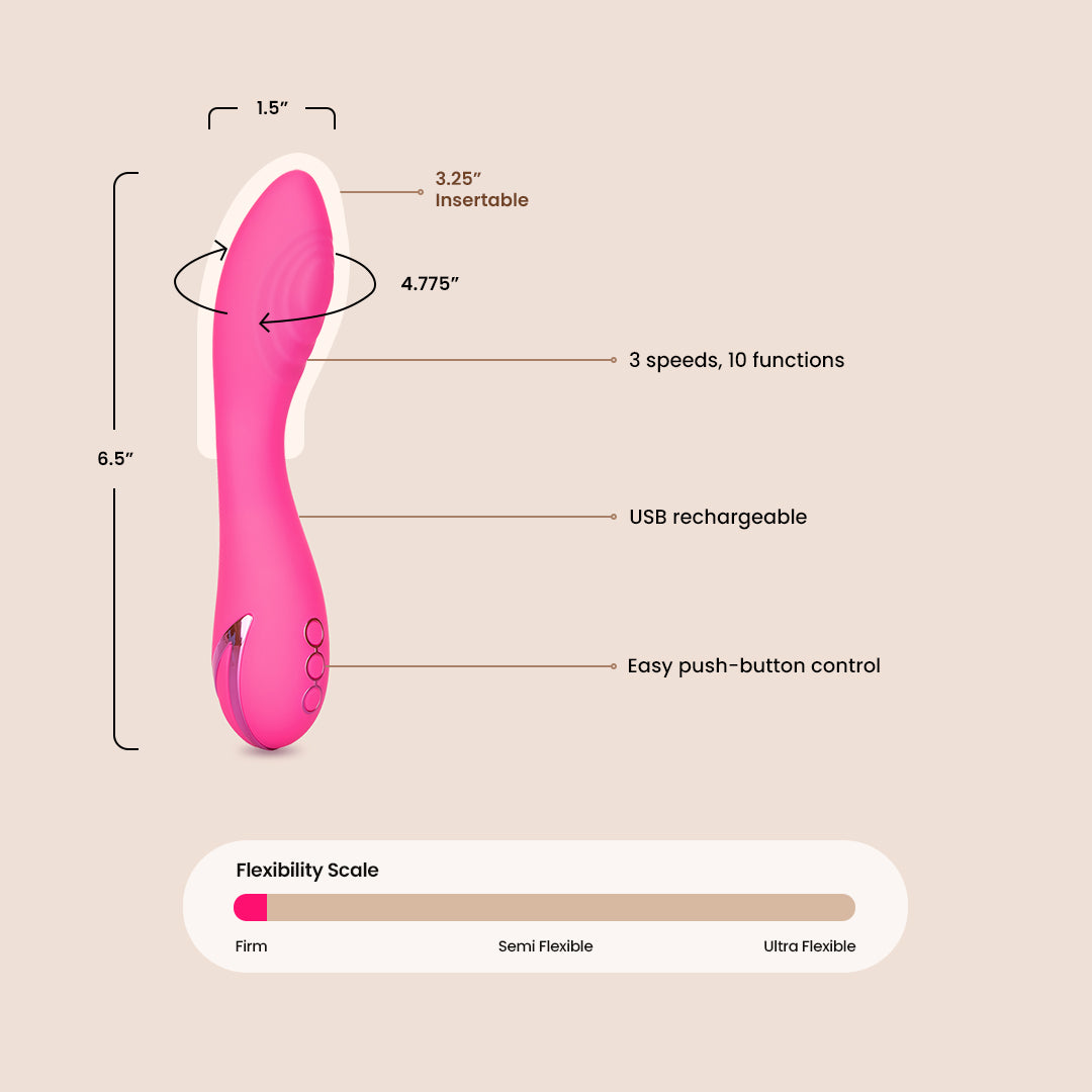 The easy-touch 2-button control lets you cycle through the knee-shaking settings or use the secure travel lock feature to let your passion takes you. Recharge the premium silicone vibrator in 2.5 hours with the provided USB charging cable to enjoy 45 minutes of high-speed stimulation or 90 minutes of low speed vibrations. While the easy-touch button controls the intensity and the vibe gives you the stimulation you want, the pliable body holds any position you desire.