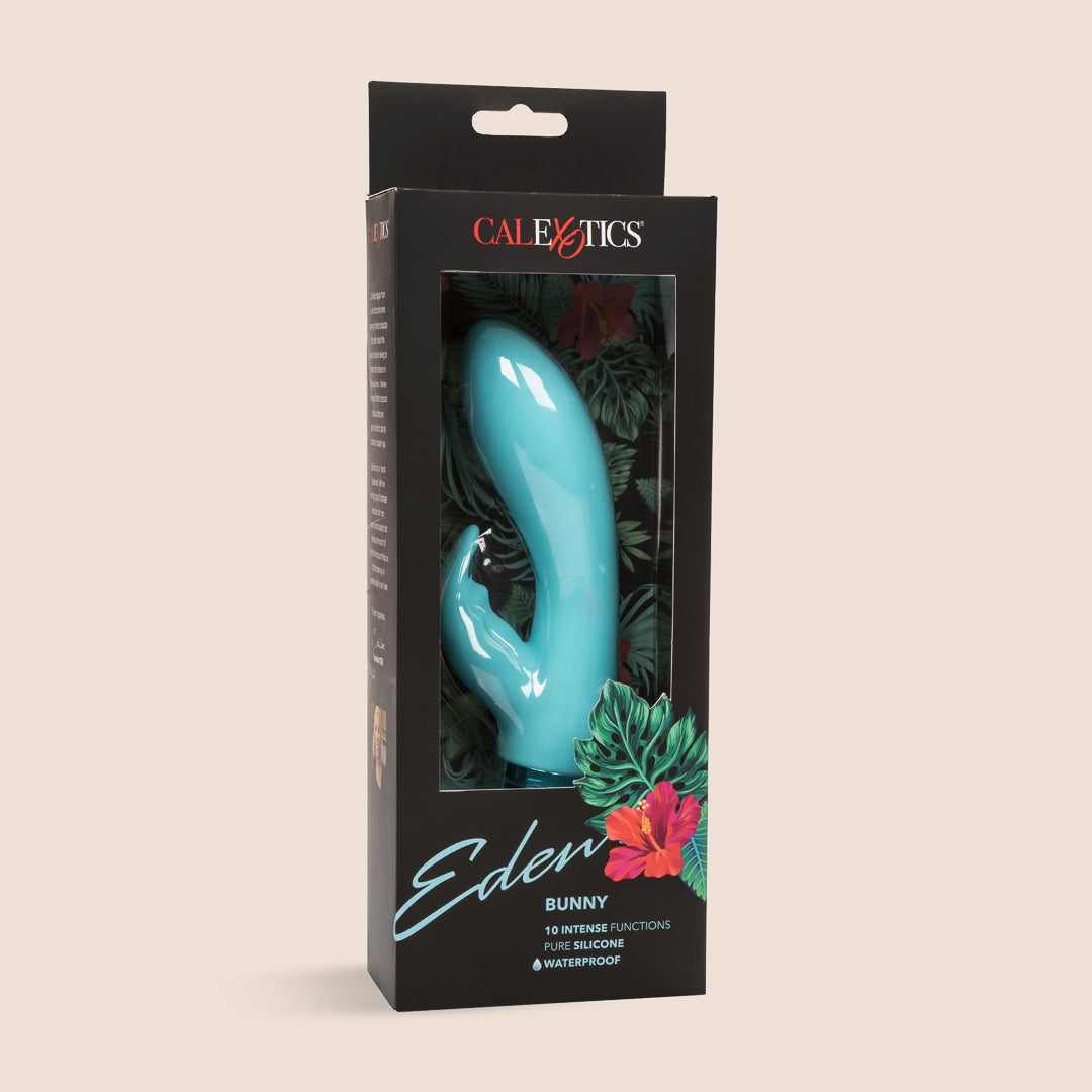 CalExotics Eden Bunny packs intense pleasure into a super soft, flexible female sex toy that will send you leaping over the edge of ecstasy. Transport yourself to a pleasure paradise with a combined G-spot massager and clitoris massager radiating with 10 intense vibration functions. The fluttering, external clit vibrator flexes with your every movement while the contoured body cozies up comfortably to you, making this waterproof vibrator an adult toy box essential for every pleasure seeker.