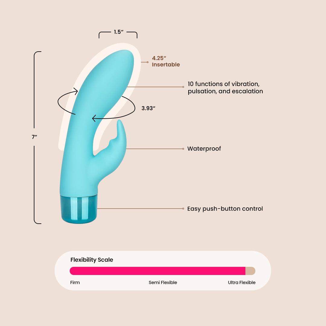 This sex toy for women offers 10 intense functions of vibration from a sensually curved shaft that works to deliver thrilling internal stimulation, plus a fluttering jack rabbit bunny tickler with an intense secondary motor that delivers flickering stimulation to external sweet spots. Take this deliciously intense personal massager for a dip and get steamy with the powerful waterproof vibrations.