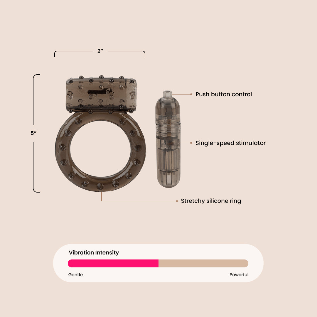 This was our first ring. Was very satisfying, and fit my bf well, considering he is quite thick. We were also able to change the little bullet to another, with different settings. The included vibe works well, but keep the batteries fresh!