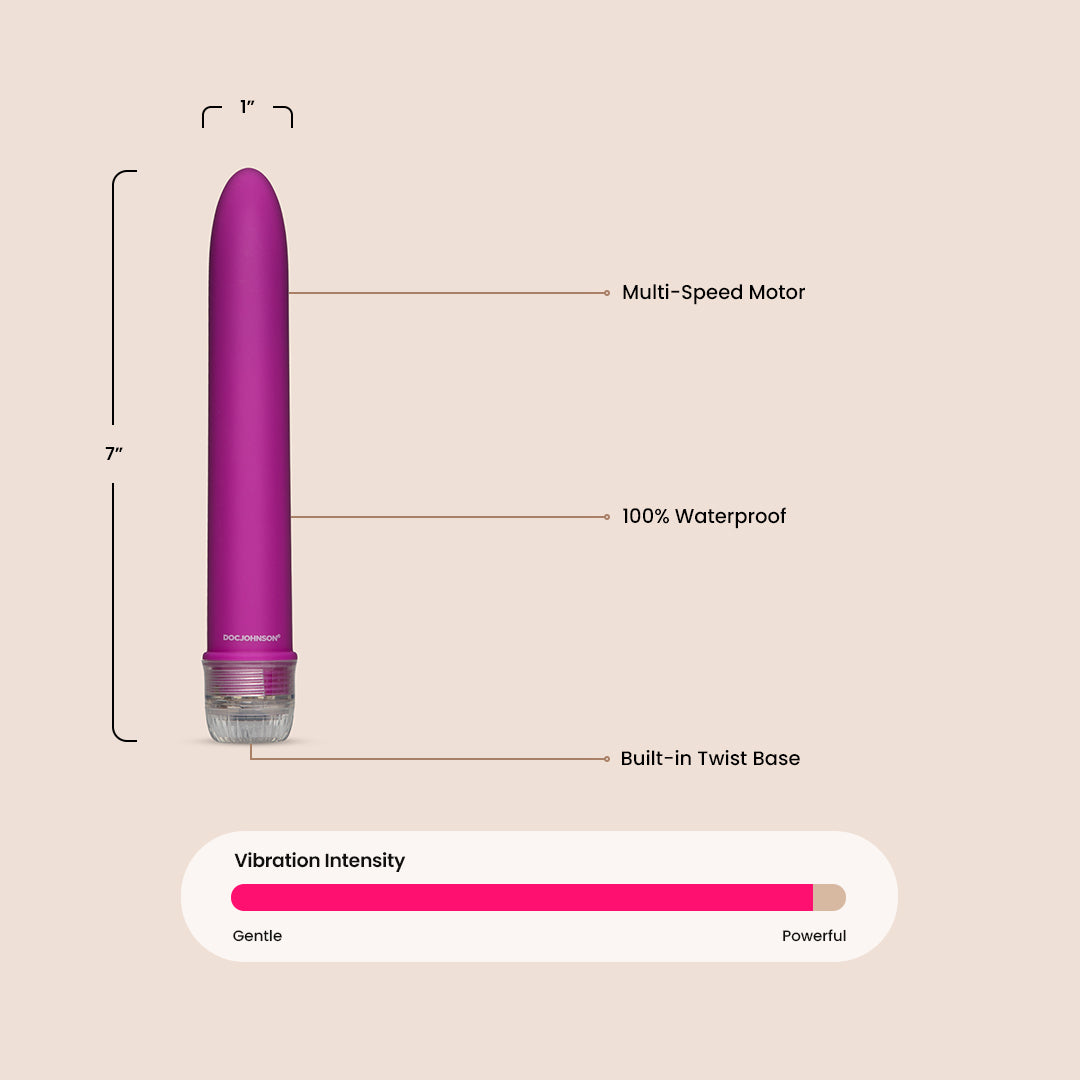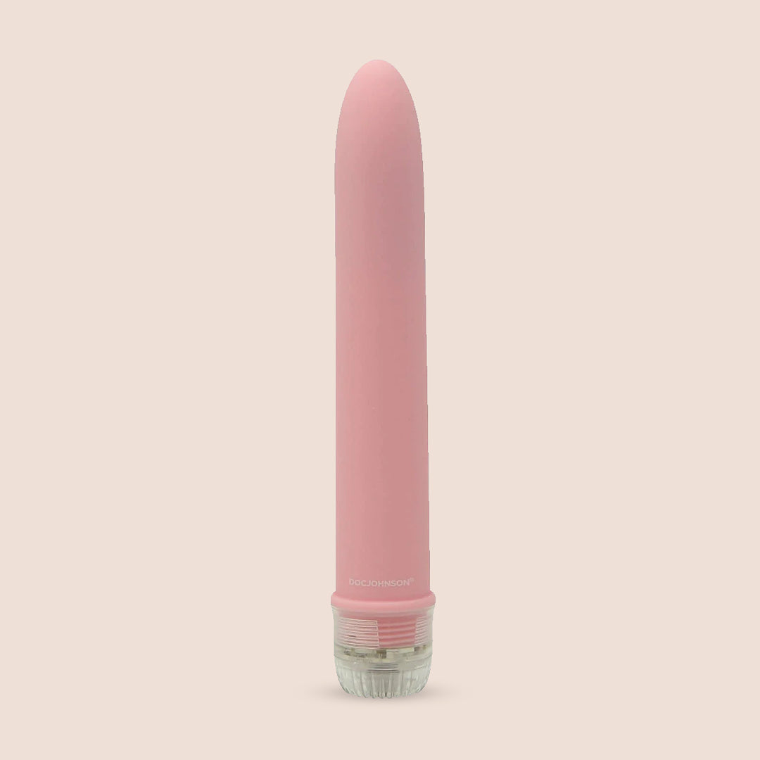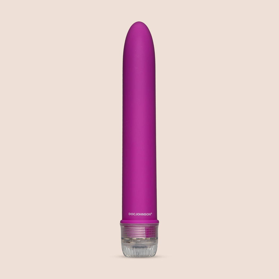 This was my first vibrator after a clerk at a sex shop recommended the Doc Johnson brand to me. It's good for beginners; incredibly smooth and soft material, powerful vibes, and excellent for all kinds of stimulation. Fun to use alone or with a partner. However, I was disappointed shortly after I purchased it because the cap cracked. This made the vibrator somewhat ineffective because the cap has to be screwed on tightly in order to use it. The batteries rattle around a little bit within the vibrator, making it awkward and noisy. Also, the vibrator became discolored after I used condoms on it, even though I cleaned it after use. Still, this vibrator is a great introduction to the wonderful world of sex toys.