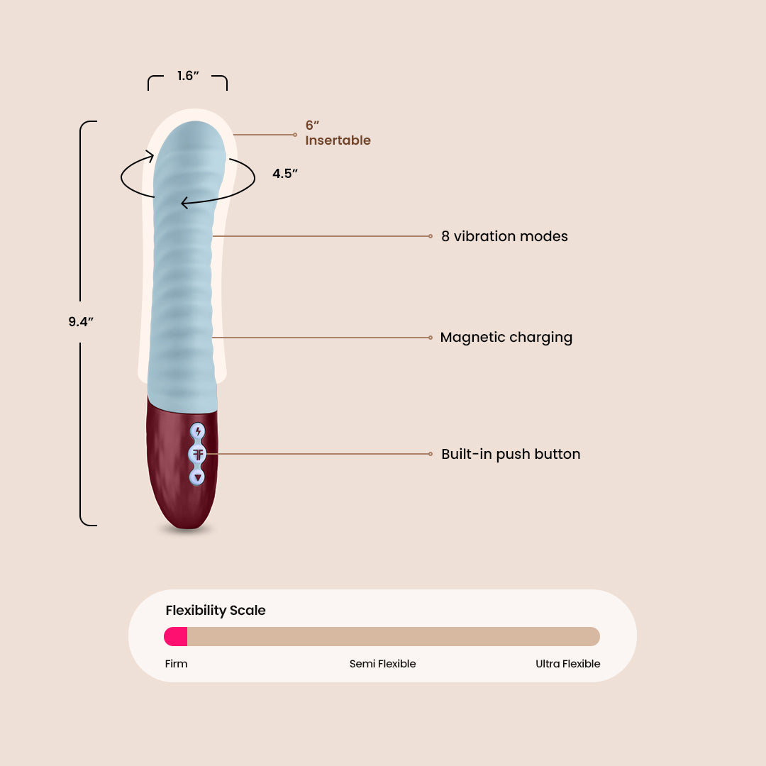 Designed with power in mind, Lola G fills up your atmosphere with its soft liquid silicone body, firm silicone core, and wavy texture. Experience layers of sensation as you flow through the 8 vibration modes, commanding your journey with two simple buttons. Ready to blast off? One click of the boost button sends you past the highest setting for 10 seconds.