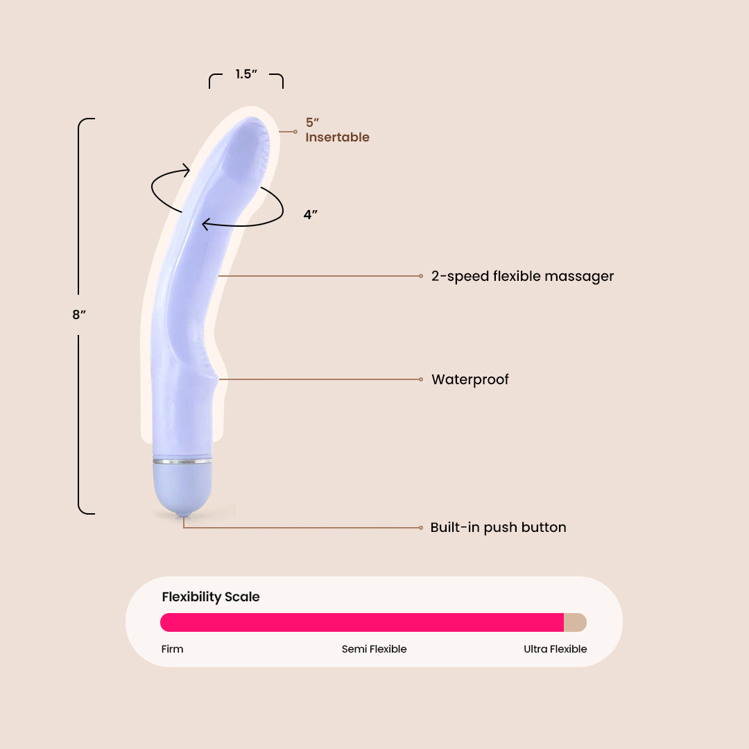 First the good. Nice size and nice vibrations. Now the truth...bends way too easily when any pressure is applied. Find that perfect spot? One move and it bends. Second issue, the material it is made from is a tacky type of silicone. Every little particle or hair will grab on to it. It's a great idea but definitely needs improvement.