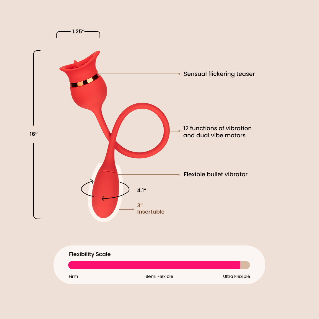 But the fun doesn't stop there - this flexible bullet will move and flex with your body to deliver some seriously intense vibrations. You can use the teaser and bullet independently or together for some seriously mind-blowing stimulation. The full contact scoop and fluttering tongue have been crafted to perfectly contour to your most intimate pleasure points, while the soft silicone and sensually contoured body allow for pinpoint pleasure from almost any angle.