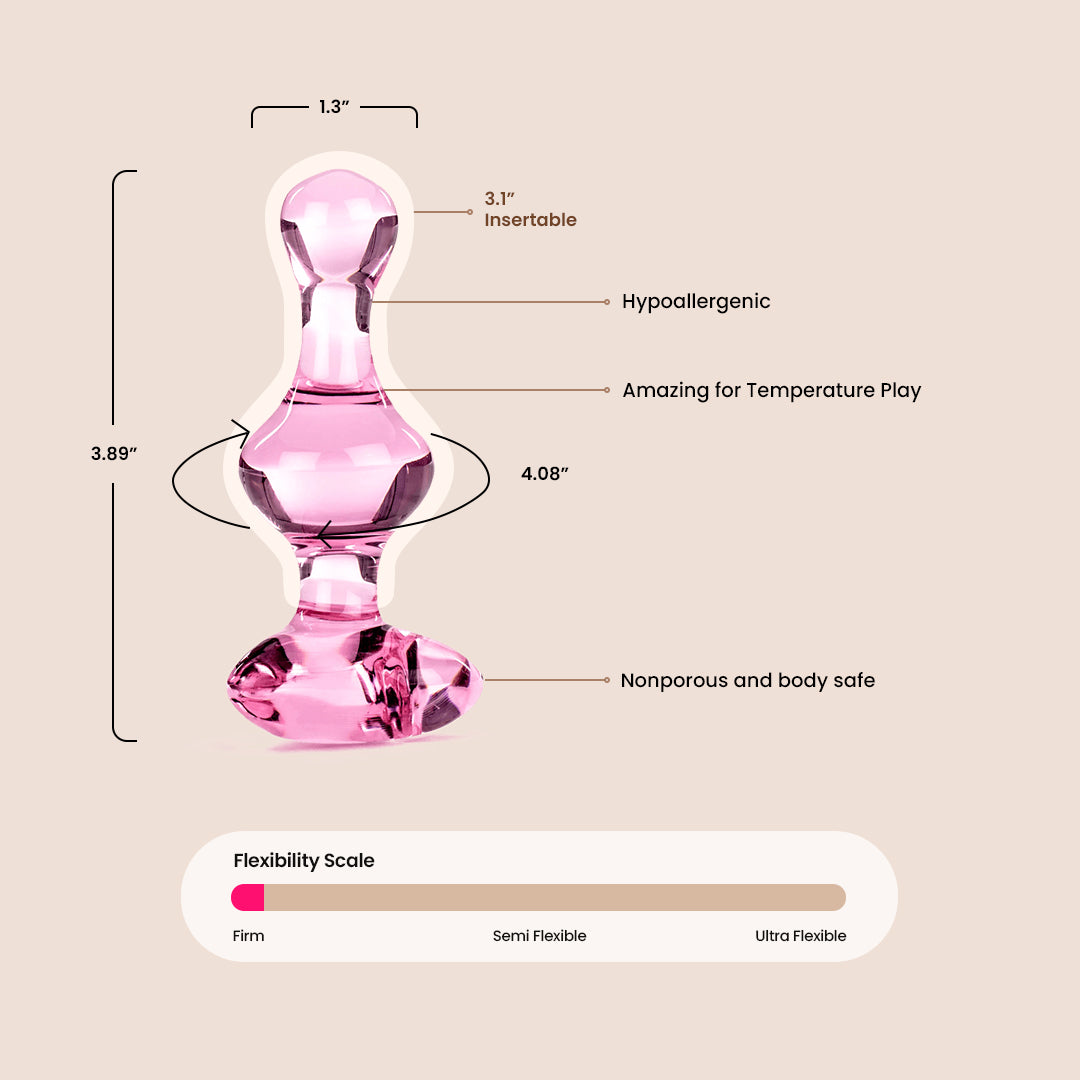 Super cute, the shape is perfect. Great for intermediates, not necessarily for beginners but it’s a great transition if you want to train yourself to go bigger. Mine came with a tiny chunk of glass missing at the base, which doesn’t affect the use much because it’s chipped on a non-insertable part of the toy. It’s still something to be aware of because it could possibility affect the longevity of the life of the toy if the chip gets bigger over time which also makes it harder to keep clean because bacteria can grow easier. Beware to inspect your toy before use.