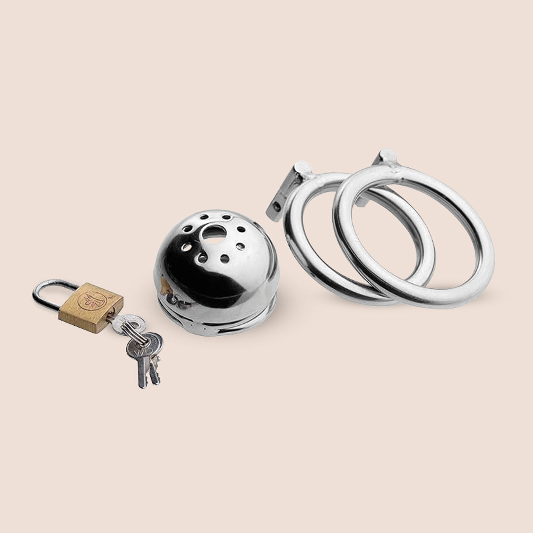 Now, he's at your beck and call, begging for release like a puppy eyeing a juicy bone. But he's not getting any action unless you say so. Crafted from sturdy stainless steel, this cage is built to withstand the longest of lock-ups. And fear not, there's a convenient pee-hole so he can still do his business without causing a fuss.