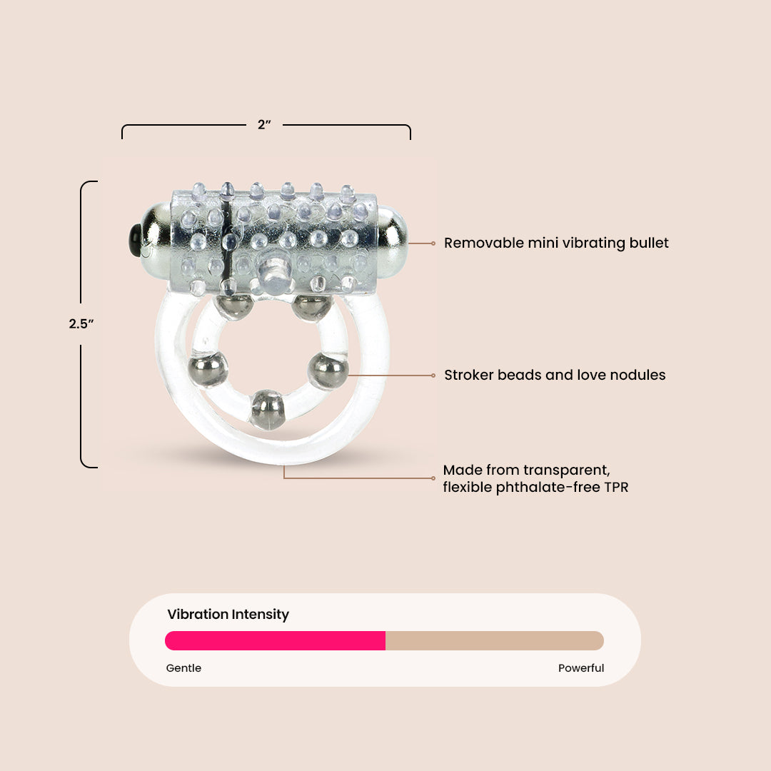 Outstanding cock ring. One of the best every purchased. The steel balls really increase the vibration to cock and balls. Big strong vibrator with 3 speeds. Only small complaint is that the lowest power still has a rather fast vibration. Stretches well. Very good quality.