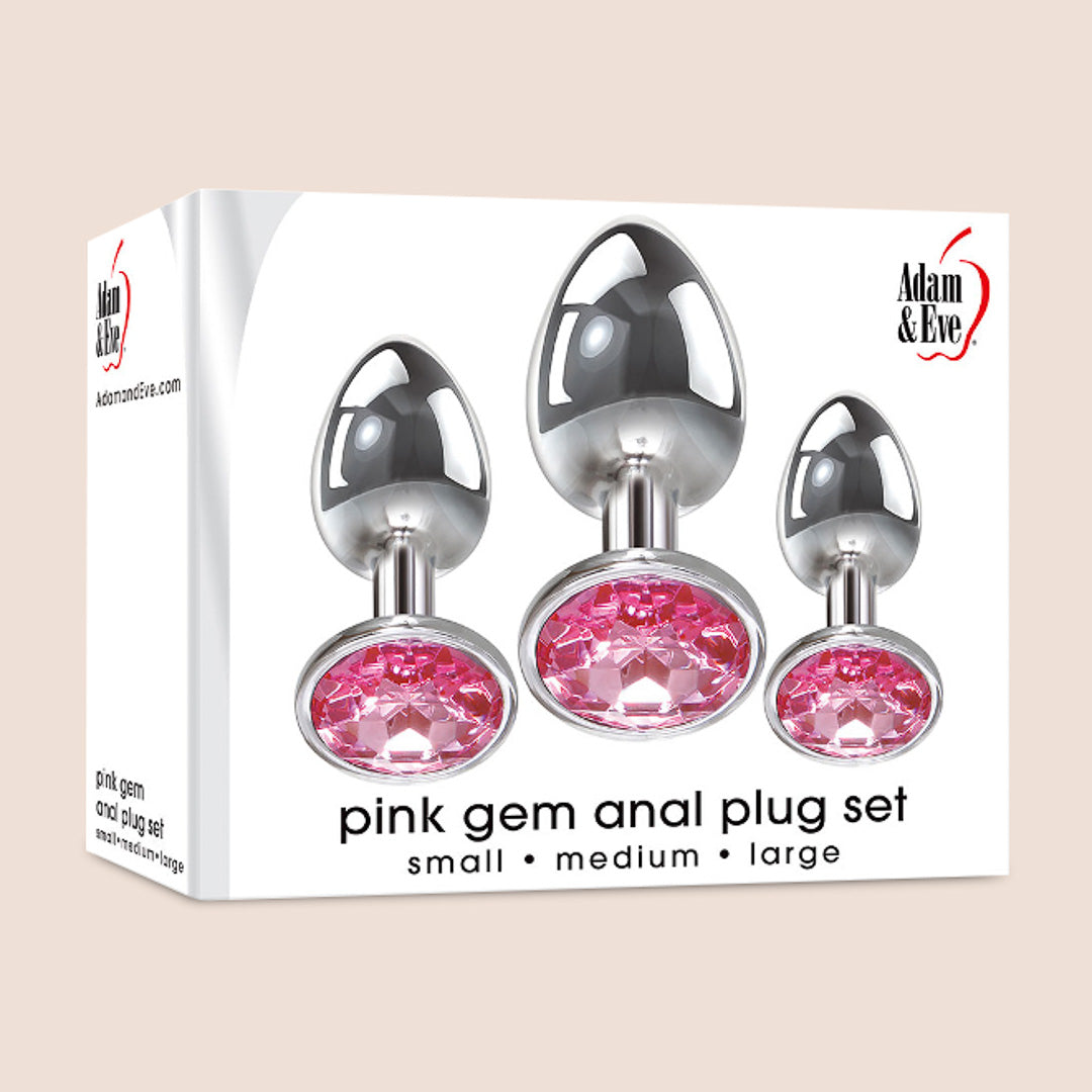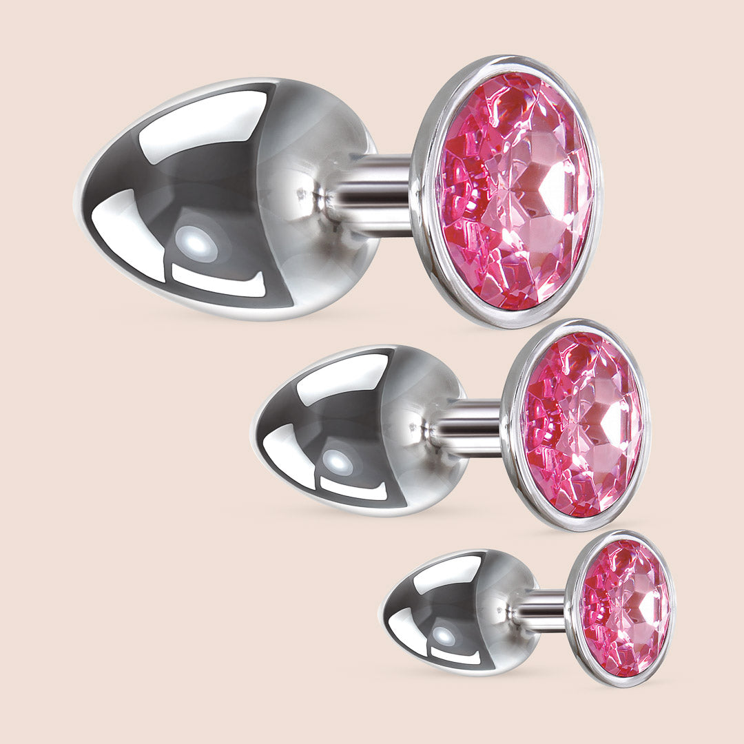 Spice up your derrière with our dazzling metal plugs that will make your booty shine! With three sizes to choose from, you can gradually explore the realms of backdoor bliss. Start with the small plug, add some lube, and let the excitement build as you delve into this oh-so-sensitive area. Show off your cheeky side with the pink jewel that peeks out, giving your partner a wink they won't forget! As you progress, the medium and large sizes will take you to unimaginable heights of anal pleasure. The sleek metal glides effortlessly, while the safety base keeps you on the right track. And hey, why not experiment with temperature? Warm it up or cool it down for an extra thrill! We've got your privacy covered too, thanks to the discreet black velvet drawstring bag included. Plus, rest easy knowing the nonporous surface is super easy to sanitize. Let the booty adventure begin!