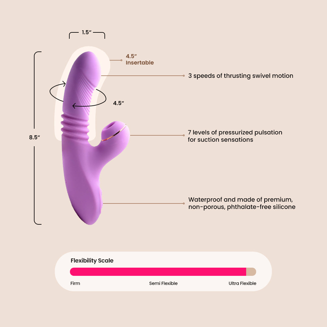 - Shaft features massaging ripples and G-spot targeting shape, with 3 speeds of thrusting swivel motion